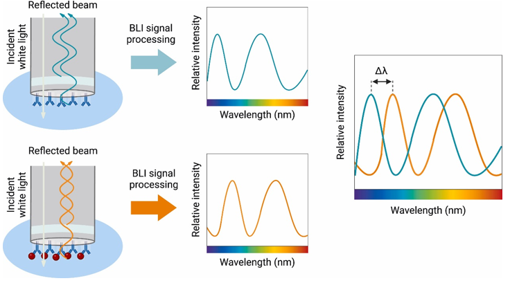生物膜干涉技术(Bio-Layer Interferometry,BLI)基于白光干涉技术(White Light Interferometry)原理。宽谱光源发出的白光近垂直入射到生物传感探针的末端表面(传感表面)。光线在其表面经历以下过程:在传感表面(第一界面,即末端功能层-液体界面),入射光发生部分反射(形成第一束反射光),部分透射进入末端固定层。透射光到达传感层(固定有配体分子的生物分子层)的远端(第二界面,即传感层-溶液界面) 时,再次发生部分反射(形成第二束反射光)。这两束反射光返回到探测器时,由于光程差不同而产生干涉。光谱仪记录下这组相干光形成的干涉光谱(通常表现为周期性振荡图谱)。