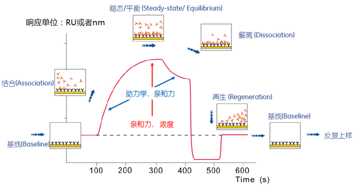 结合(Association):当溶液中的分析物(Analyte)与固定在传感表面上的配体(Ligand) 结合时,传感表面生物分子层的厚度增加。