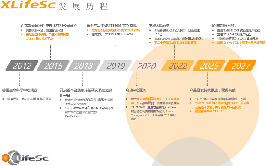 公司持续拼搏,于2018年开启了首条管线的临床前研究,并与美国通用电气公司达成全面合作建造了全球首条自动化TCR-T细胞灵活生产工厂FlexFactoryTM,同年将首条管线的部分权益授权给美国上市公司Athenex。2019年,首个管线产品TAEST16001注射液IND获批,成为首个获批中国IND的TCR-T细胞治疗产品。2020年香雪精准成立了子公司——香雪生命科技技术(广东)有限公司(简称:香雪生命科学或XLifeSc,即现在的公司名称),并启动了A轮融资。2022年,完成A轮融资2.1亿元人民币,并完成首个产品的I期临床研究,其安全性得到确认,同年获得第二款产品TAEST1901注射液的IND批件。2023年,首款产品完成II期临床研究第一阶段,因疗效显著于2024年8月被CDE纳入突破性治疗名单,2025年启动了确证性临床研究,并获批了两个新增适应症的IND。首款产品预计将在2027年底获批上市。经过10多年的深耕和发展,XLifeSc已成为国内TCR免疫治疗的头部企业,已建成了多个成熟的功能团队,包括技术研发团队、临床研究团队、细胞生产团队、质量(QA,QC)团队、公司运营团队、业务(市场)开发团队和财务管控团队。公司将不忘初心、奋力前行,为癌症患者开辟一条全新的有望治愈的癌症治疗途径,据此在该赛道代表中国参与国际竞争,提升中国生物医药产业的国际竞争力。