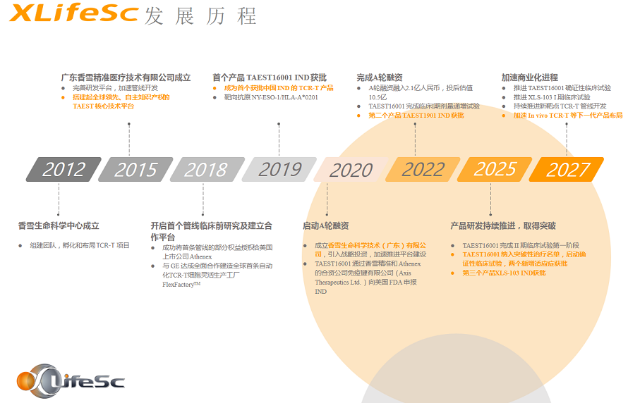 公司持续拼搏,于2018年开启了首条管线的临床前研究,并与美国通用电气公司达成全面合作建造了全球首条自动化TCR-T细胞灵活生产工厂FlexFactoryTM,同年将首条管线的部分权益授权给美国上市公司Athenex。2019年,首个管线产品TAEST16001注射液IND获批,成为首个获批中国IND的TCR-T细胞治疗产品。2020年香雪精准成立了子公司——香雪生命科技技术(广东)有限公司(简称:香雪生命科学或XLifeSc,即现在的公司名称),并启动了A轮融资。2022年,完成A轮融资2.1亿元人民币,并完成首个产品的I期临床研究,其安全性得到确认,同年获得第二款产品TAEST1901注射液的IND批件。2023年,首款产品完成II期临床研究第一阶段,因疗效显著于2024年8月被CDE纳入突破性治疗名单,2025年启动了确证性临床研究,并获批了两个新增适应症的IND。2025年12月,第三款产品XLS-103注射液获批两个IND,适应症分别为晚期非小细胞肺癌、晚期胰腺癌。首款产品预计将在2027年底获批上市。经过10多年的深耕和发展,XLifeSc已成为国内TCR免疫治疗的头部企业,已建成了多个成熟的功能团队,包括技术研发团队、临床研究团队、细胞生产团队、质量(QA,QC)团队、公司运营团队、业务(市场)开发团队和财务管控团队。公司将不忘初心、奋力前行,为癌症患者开辟一条全新的有望治愈的癌症治疗途径,据此在该赛道代表中国参与国际竞争,提升中国生物医药产业的国际竞争力。
