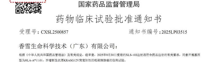 近日,香雪生命科学技术(广东)有限公司(以下简称“香雪生命科学”)自主研发的高亲和力TCR-T细胞治疗产品“XLS-103注射液”针对晚期胰腺癌的新药临床试验申请(IND)正式获得CDE的临床试验许可,业内反响热烈。