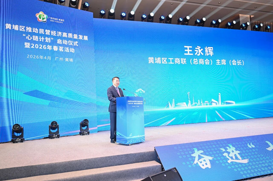 黄埔区工商联主席、香雪制药董事长王永辉应邀上台致辞,立足区域民营经济发展全局,传递政企同心、共促发展的坚定信念。他代表黄埔区工商联(总商会),对莅临现场的各级领导、来宾表示欢迎,向关心支持黄埔民营经济发展的各方及全体企业家、商协会同仁致以敬意和问候;回顾肯定过去一年黄埔民营经济发展成效,通报民营高新技术企业占比超92%、上市公司数量居全国经开区首位等关键数据,介绍区工商联相关荣誉成就;并寄语全体黄埔民企,以“两业协同”为翼、源头创新为核,借“心链计划”东风,凝心实干,共谱民营经济高质量发展新篇章,为中国式现代化建设贡献黄埔民企力量。